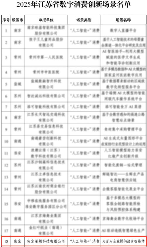 江苏省数据局联合省发展改革委发布数字消费创新场景名单,南京星蝠科技有限公司(品牌名"云蝠智能")成功入选 江苏省数字消费创新场景名单!
