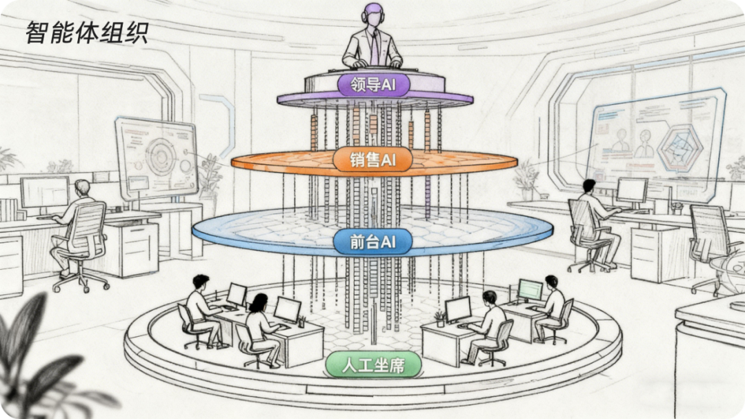 区别于行业单一 AI 交互模式,云蝠智能首创 “智能体组织” 概念 —— 让 AI 像蜂群一样分工协作,形成 “前台 AI + 销售 AI + 领导 AI + 人工坐席” 的数字化协作体系: