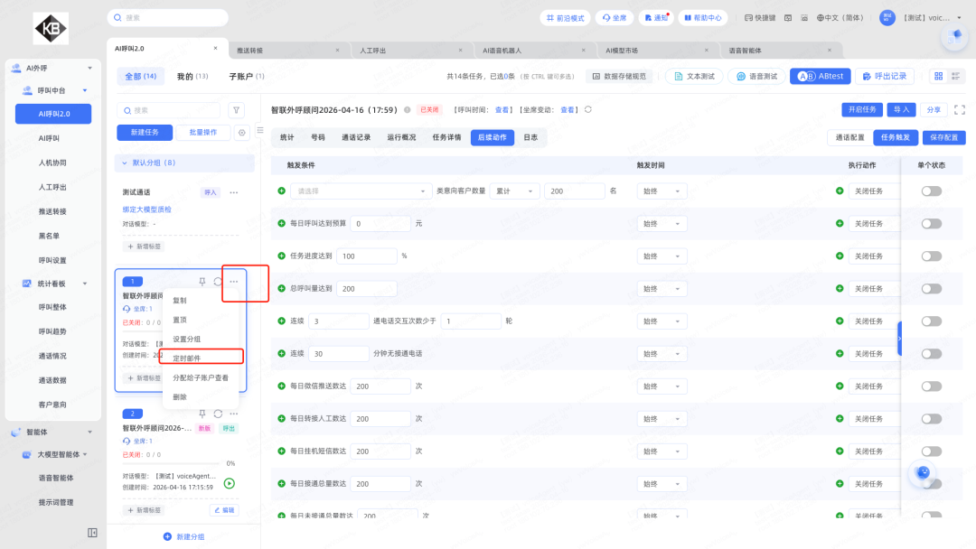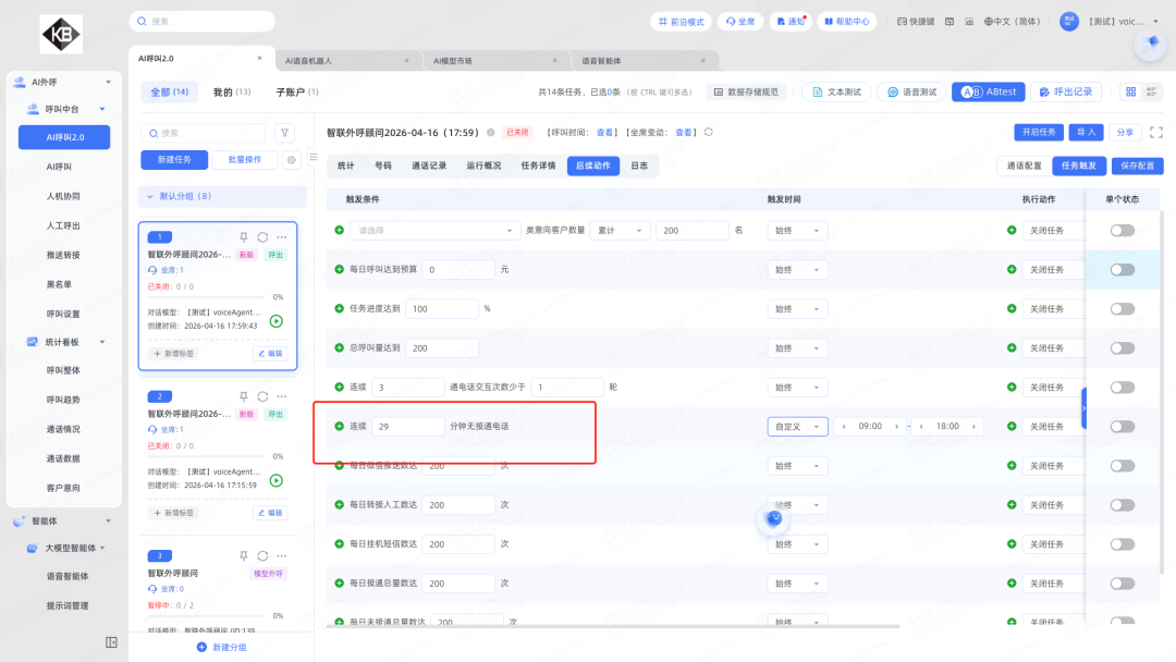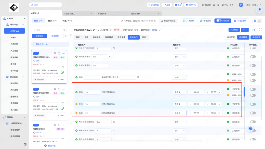 3.触发条件优化:每组触发条件可创建多个;支持在指定时间段内触发(如9~12点连续3通电话);呼入场景也支持所有触发条