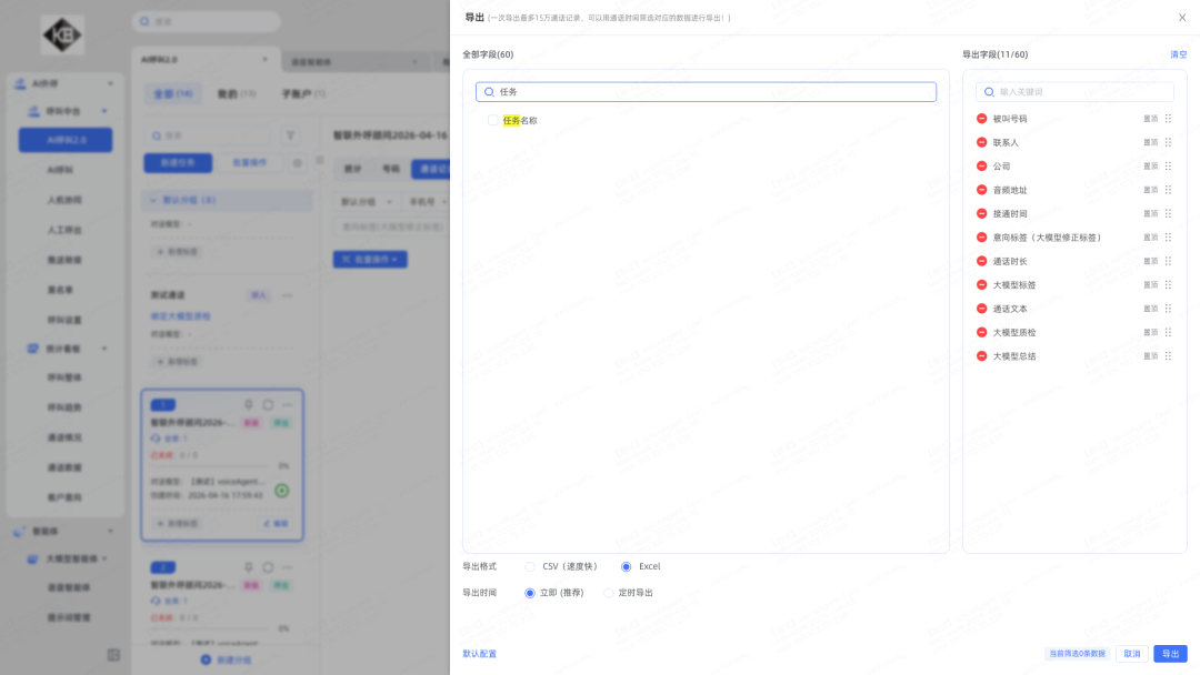 10.通话记录导出增加“任务名称”字段:列表展示“任务名称”,并支持导出、搜索、排序