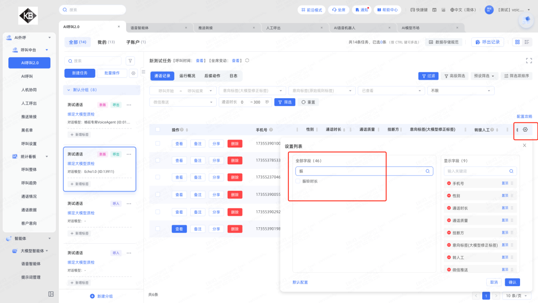 9.通话记录列表及详情展示振铃时长:增加“振铃时长”字段,并支持导出