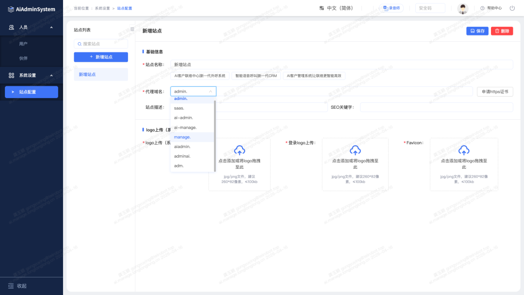 6.站点配置域名解析优化:销售端配置域名解析添加前缀 adm,代理端添加前缀 agent