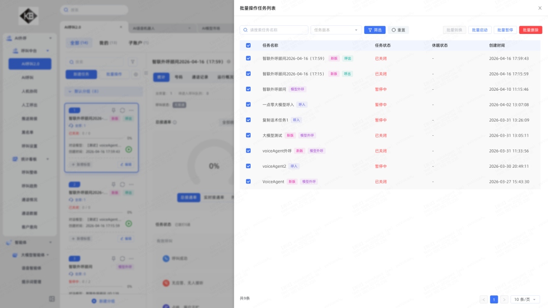 1.任务列表支持批量操作:新增批量启动、批量暂停、批量删除功能