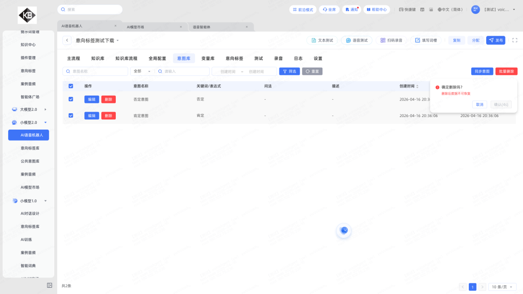 1.意图库批量操作:支持多选意图后批量删除(二次确认+5秒倒计时);支持将多选意图同步到当前账户的其他机器人