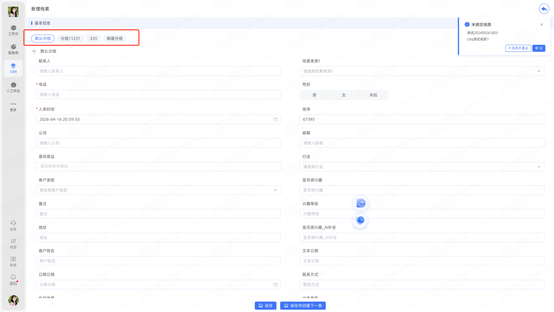 1.CRM线索按分组展示:新增CRM分组后,线索对应的字段也按CRM字段分组归类展示